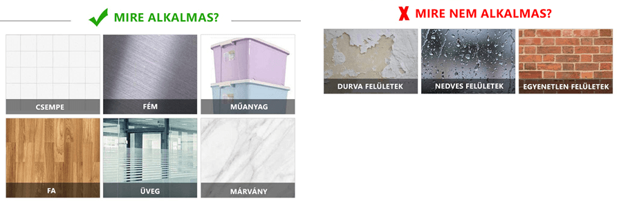 Használhatod beltéren mindenféle dekorációhoz, képek, poszterek felhelyezéséhez. Kültéren házszámok, címkék, boltoknak cégérek, tájékoztatók, táblák felragasztásához is nagyszerű.